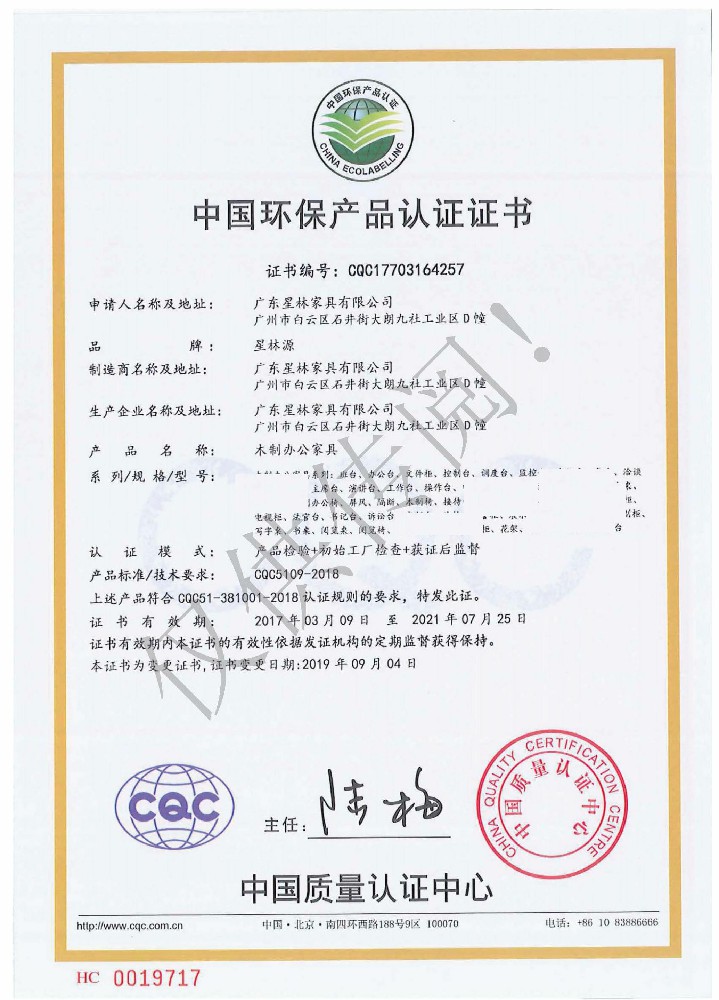 廣東星林家具有限公司創建于家具盛世之期,專業致力于辦公家具、醫療家具、養老家具的開發、設計、生產。公司率先通過ISO9001質量管理體系認證和ISO14001環境管理體系認證及職業健康安全管理體系認證,從而獲得了中環聯合(北京)認證中心有限公司頒發的“中國環境標志產品認證證書(十環認證)”等。